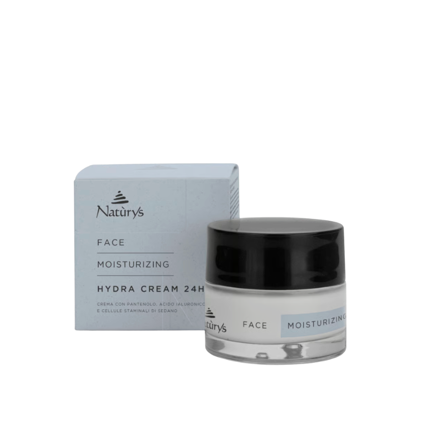 HYDRA CREAM 24 H. Drėkinanti ir maitinanti veido rutina. Ingredientas Acetyl-tetrapeptidas-5 pakelia drėgmės lygį odoje, saugo nuo vandens netekimo, mažina senėjimo požymius. Vynmedžio sula sureguliuoja mikrobiotą. Oda tampa minkšta,