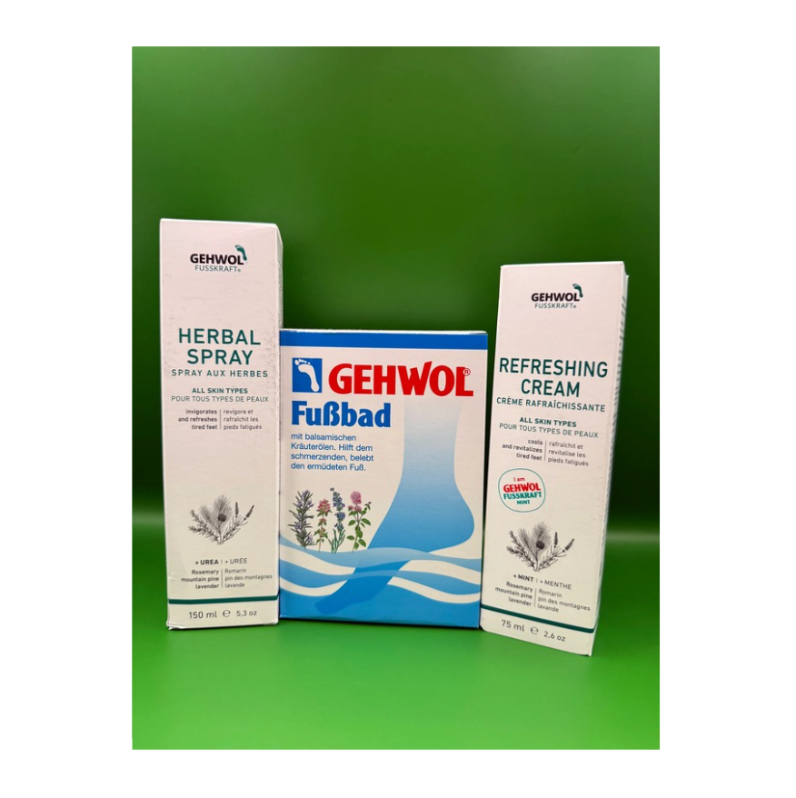 Druskų vonelė atgaivinanti pėdas + vėsinantis pėdų kremas + atgavinantis pėdų puškalas