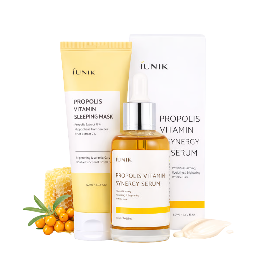 Atraskite kasdienės ramybės ir natūralaus švytėjimo derinį su iUNIK Propolis Vitamin serumu ir miego kauke. Šis duetas sukurtas odai, kuriai reikia raminimo, intensyvaus maitinimo ir skaistinimo.