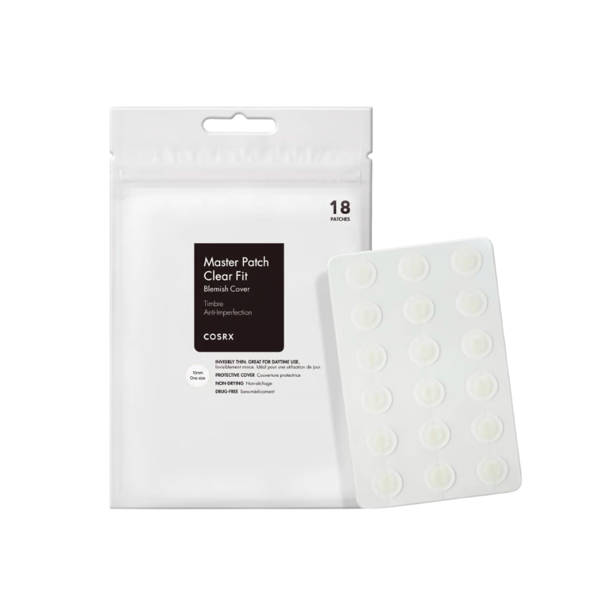 COSRX Clear Fit Master Patch – pleistrai nuo spuogų (18 vnt.) – matiniai, itin ploni pleistriukai natūraliai prilimpa prie odos, puikiai tinka naudoti dieną, nes po makiažo tampa nepastebimas.