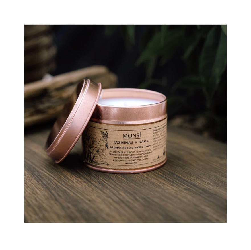 Aromatinė sojų vaško žvakė metaliniame indelyje – Tobula namams, dovanai ir kelionėms