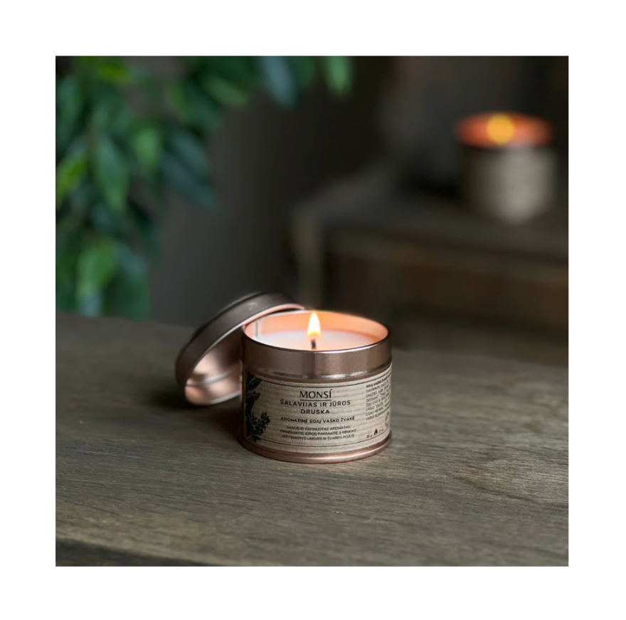 Aromatinė sojų vaško žvakė metaliniame indelyje – tobula namams, dovanai ir kelionėms