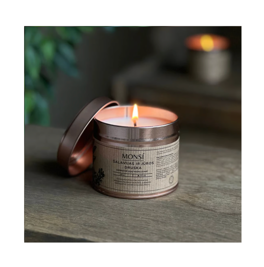 Aromatinė sojų vaško žvakė metaliniame indelyje – tobula namams, dovanai ir kelionėms